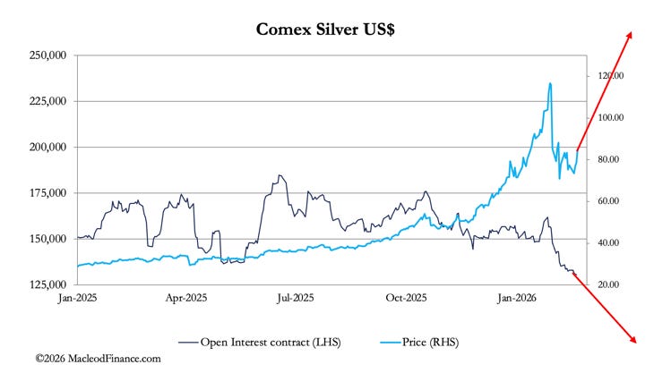 The second chart compares silver’s price with overall open interest. Instead of expanding alongside price, open interest is falling sharply. That pattern does not normally accompany speculative manias. It suggests contracts are being closed out rather than added.