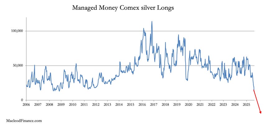 The first chart tracks managed money long positions going back nearly twenty years. Hedge fund exposure is now close to historic lows. In a typical bull market, rising prices attract speculative participation. Here, positioning is shrinking even as prices strengthen — an unusual divergence.