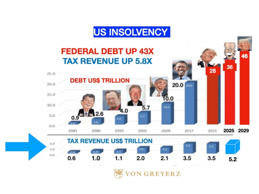 Over the past decades, US debt has not grown linearly, but exponentially—doubling on average every eight years, regardless of the political cycle.